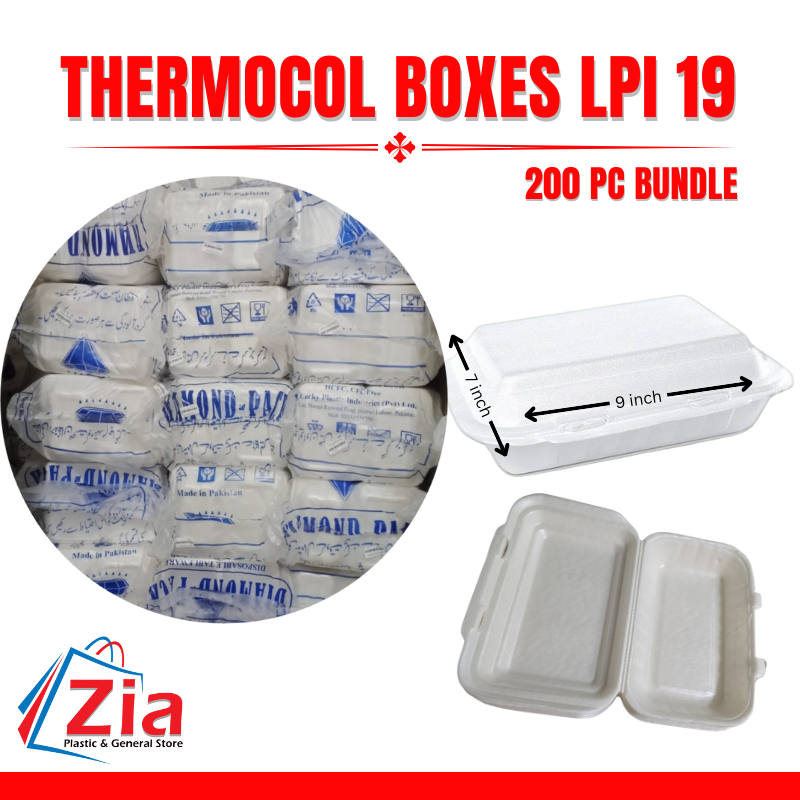 A Thermocol LPI-19 Box is a durable, lightweight, and hygienic food packaging box made from thermocol (EPS foam). It is ideal for packing rice, biryani, fast food, and takeaway meals. Widely used by restaurants, catering services, and food delivery businesses, it keeps food fresh and safe during transport.